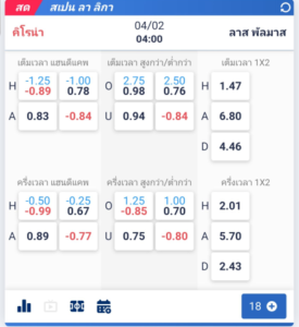 1.1 ค่าน้ำมาเลย์แบบสีแดงนั้น จะมีเครื่องหมาย – อยู่ด้านหน้า ค่าน้ำนี้คือค่าน้ำแบบจะมีการคืนทุนหรือถ้าเสียก็เสียได้ เต็มถ้าได้จะได้เต็ม ตัวอย่างเช่นในภาพ ถ้าผู้เล่นเดิมพันคิโรน่า ต่อ-1.25 ค่าน้ำ-0.89 100บ. นั้นหมายความว่าผู้เล่น จะได้ทุนคืนมาทันที 11บ. ถ้าหากผู้เล่นเป็นฝ่ายชนะเจ้ามือจะจ่ายรวมทุนมาที 189บ. ผู้เล่นจะได้กำไรเต็มจำนวน เพราะว่า รวมกับทุมคืนเดิมอีก 11บ. 189+11=200บ. แต่ถ้าหากเสียก็จะเสียแค่ 89บ. ครับ 1.2 ค่าน้ำมาเลยฯแบบสีดำ จะไม่มีเครื่องหลาย – อยู่ด้านหน้า ค่าน้ำแบบนี้คือการบอกจ่ายกำไรแบบตรงๆเลยครับ ตัวอย่างเช่นในภาพ ถ้าผู้เล่นเลือกเดิมพันไปที่ รอง ลาส พัลมาส 1.25 ค่าน้ำ 0.83 นั้นหมายความว่าผู้เล่นเดิมพัน 100บ. ถ้าหากผู้เล่นเป็นฝ่ายชนะ จะได้กำไร 83บ. เจ้ามือจ่ายรวมทุน 183บ. แต่ถ้าหากเสียคือเสีย100บ. เสียเต็ม จำนวนครับ