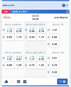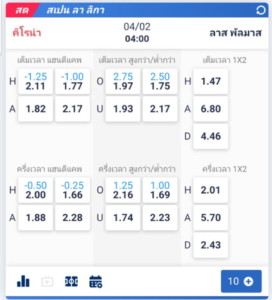 1.1 ค่าน้ำมาเลย์แบบสีแดงนั้น จะมีเครื่องหมาย – อยู่ด้านหน้า ค่าน้ำนี้คือค่าน้ำแบบจะมีการคืนทุนหรือถ้าเสียก็เสียได้ เต็มถ้าได้จะได้เต็ม ตัวอย่างเช่นในภาพ ถ้าผู้เล่นเดิมพันคิโรน่า ต่อ-1.25 ค่าน้ำ-0.89 100บ. นั้นหมายความว่าผู้เล่น จะได้ทุนคืนมาทันที 11บ. ถ้าหากผู้เล่นเป็นฝ่ายชนะเจ้ามือจะจ่ายรวมทุนมาที 189บ. ผู้เล่นจะได้กำไรเต็มจำนวน เพราะว่า รวมกับทุมคืนเดิมอีก 11บ. 189+11=200บ. แต่ถ้าหากเสียก็จะเสียแค่ 89บ. ครับ 1.2 ค่าน้ำมาเลยฯแบบสีดำ จะไม่มีเครื่องหลาย – อยู่ด้านหน้า ค่าน้ำแบบนี้คือการบอกจ่ายกำไรแบบตรงๆเลยครับ ตัวอย่างเช่นในภาพ ถ้าผู้เล่นเลือกเดิมพันไปที่ รอง ลาส พัลมาส 1.25 ค่าน้ำ 0.83 นั้นหมายความว่าผู้เล่นเดิมพัน 100บ. ถ้าหากผู้เล่นเป็นฝ่ายชนะ จะได้กำไร 83บ. เจ้ามือจ่ายรวมทุน 183บ. แต่ถ้าหากเสียคือเสีย100บ. เสียเต็ม จำนวนครับ